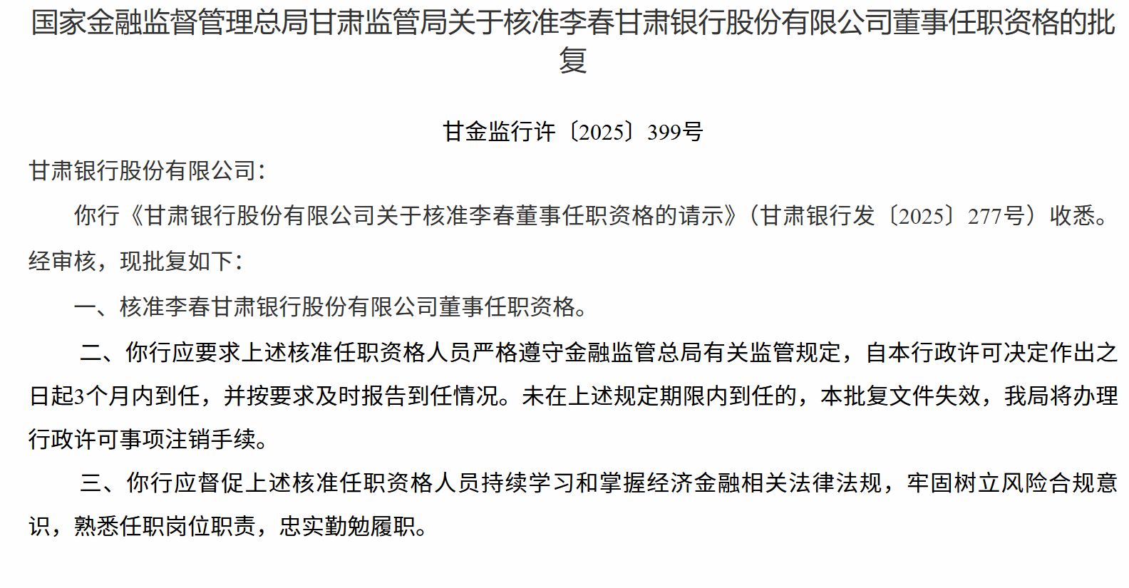 12月11日,国家金融监督管理总局甘肃监管局发布关于核准李春甘肃银行股份有限公司董事任职资格的批复,核准李春甘肃银行股份有限公司董事任职资格。