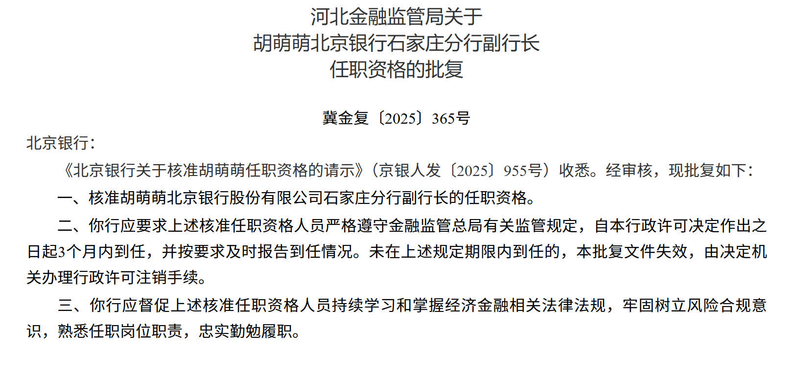 12月12日,河北金融监管局发布关于胡萌萌北京银行石家庄分行副行长任职资格的批复,核准胡萌萌北京银行股份有限公司石家庄分行副行长的任职资格。